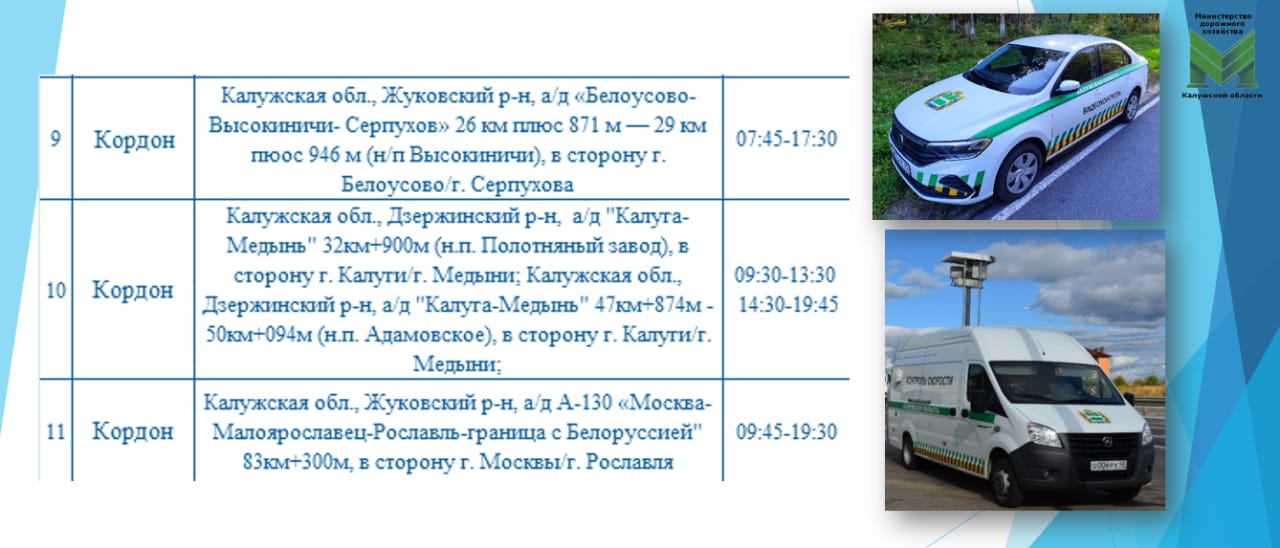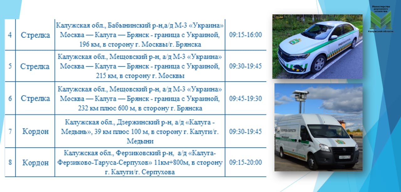 В области видео и фотофиксация проходит на трассе М-3 «Украина» и автодорогах Калуга-Медынь, Калуга-Ферзиково-Таруса-Серпухов, Белоусово-Высокиничи-Серпухов, Москва-Малоярославец-Рославль-граница с Беларусью, Мещовском, Ферзиковском, Жуковском, Бабынинском и Дзержинском районах.