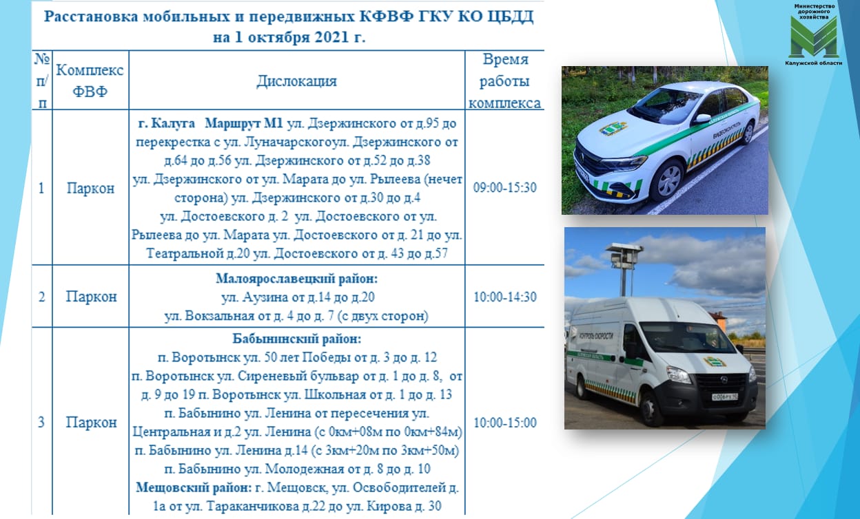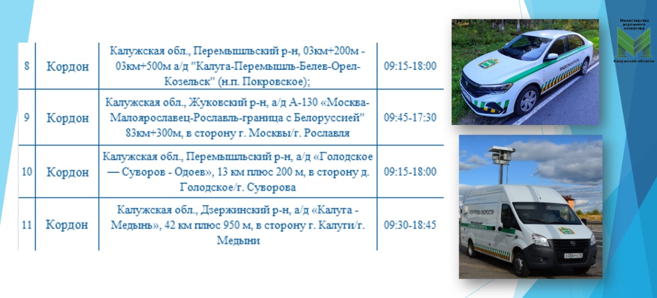 В области видео и фотофиксация проходит в городе Малоярославец на улицах Аузина и Вокзальная, в поселке Воротынск на улицах 50 лет Победы, Сиреневый бульвар и Школьная, в поселке Бабынино на улицах Ленина и Молодежная, в городе Мещовск на улице Освободителей.