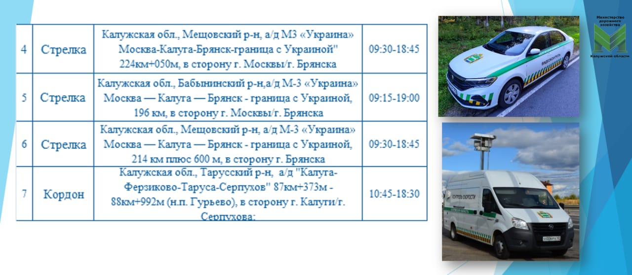 Также камеры работают на трассе М-3 «Украина» и автодорогах Калуга-Медынь, Калуга-Ферзиково-Таруса-Серпухов, Калуга-Перемышль-Белев-Орел-Козельск, Голодское-Суворов-Одоев, Москва-Малоярославец-Рославль-граница с Беларусью, Мещовском, Тарусском, Перемышльском, Жуковском, Бабынинском и Дзержинском районах.