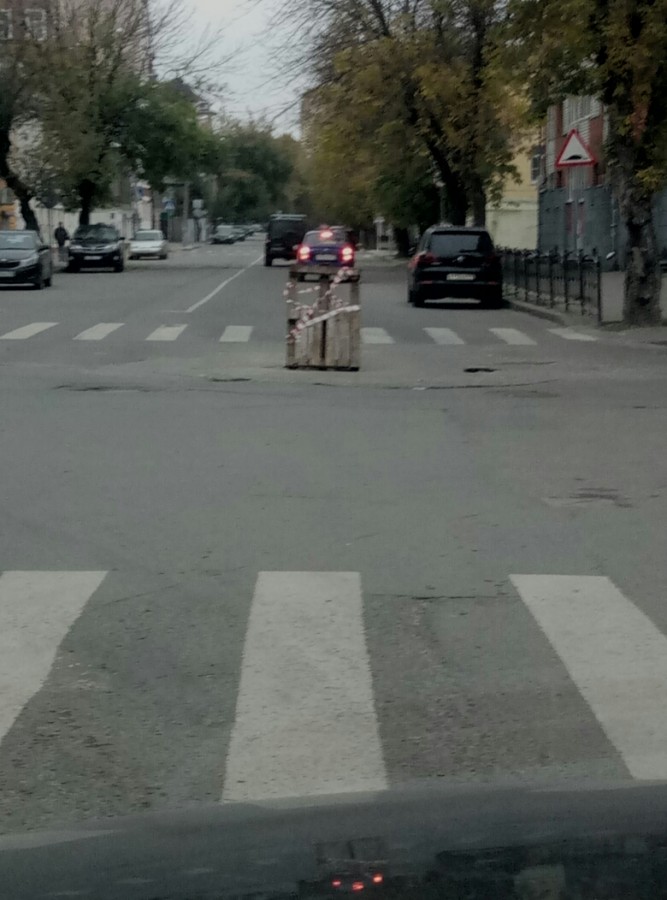 На прошлой неделе пользователь нашего сайта caesar сообщал про яму на перекрестке улиц Воронина и Огарева в Калуге. Автомобилисты самостоятельно обозначили ее деревянным поддоном и лентами.