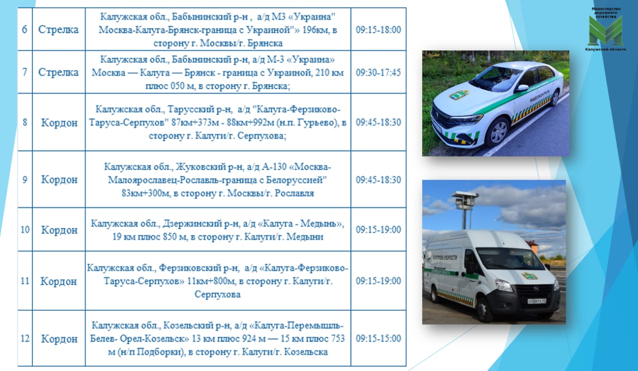 А также на трассе М-3 «Украина» и автодорогах Калуга-Медынь, Калуга-Перемышль-Белев-Орел-Козельск, Калуга-Ферзиково-Таруса-Серпухов, Москва-Малоярославец-Рославль-граница с Беларусью, Калуга-Перемышль-Белев-Орел-Козельск, Перемышльском, Козельском, Мещовском, Ферзиковском, Бабынинском, Тарусском, Жуковском и Дзержинском районах.