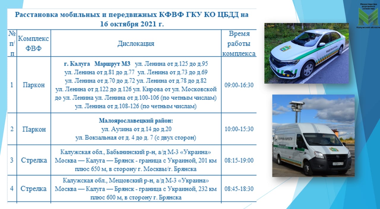 Расстановка мобильных камер на сегодня в Калуге и области.