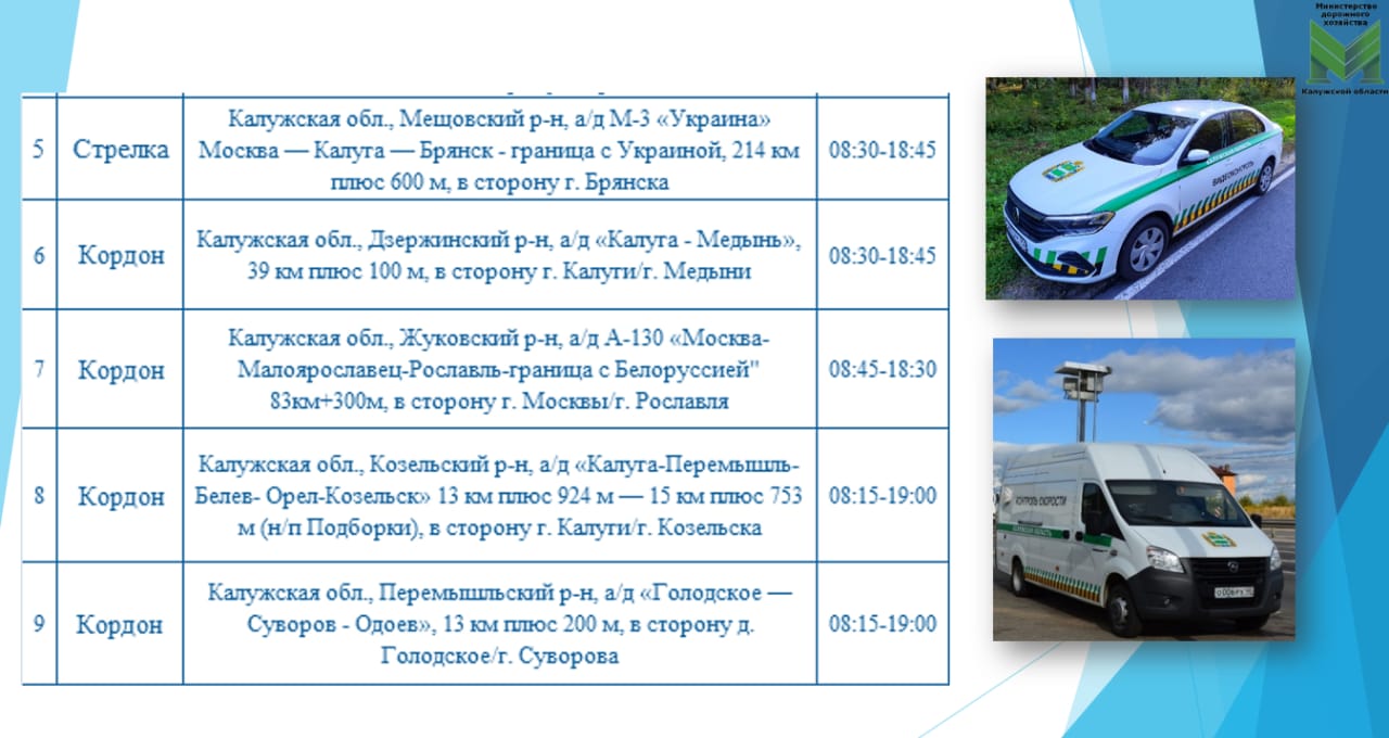 А также на трассе М-3 «Украина» и автодорогах Калуга-Медынь, Голодское-Суворов-Одоев, Москва-Малоярославец-Рославль-граница с Беларусью, Калуга-Перемышль-Белев-Орел-Козельск, Перемышльском, Козельском, Мещовском, Бабынинском, Жуковском и Дзержинском районах.