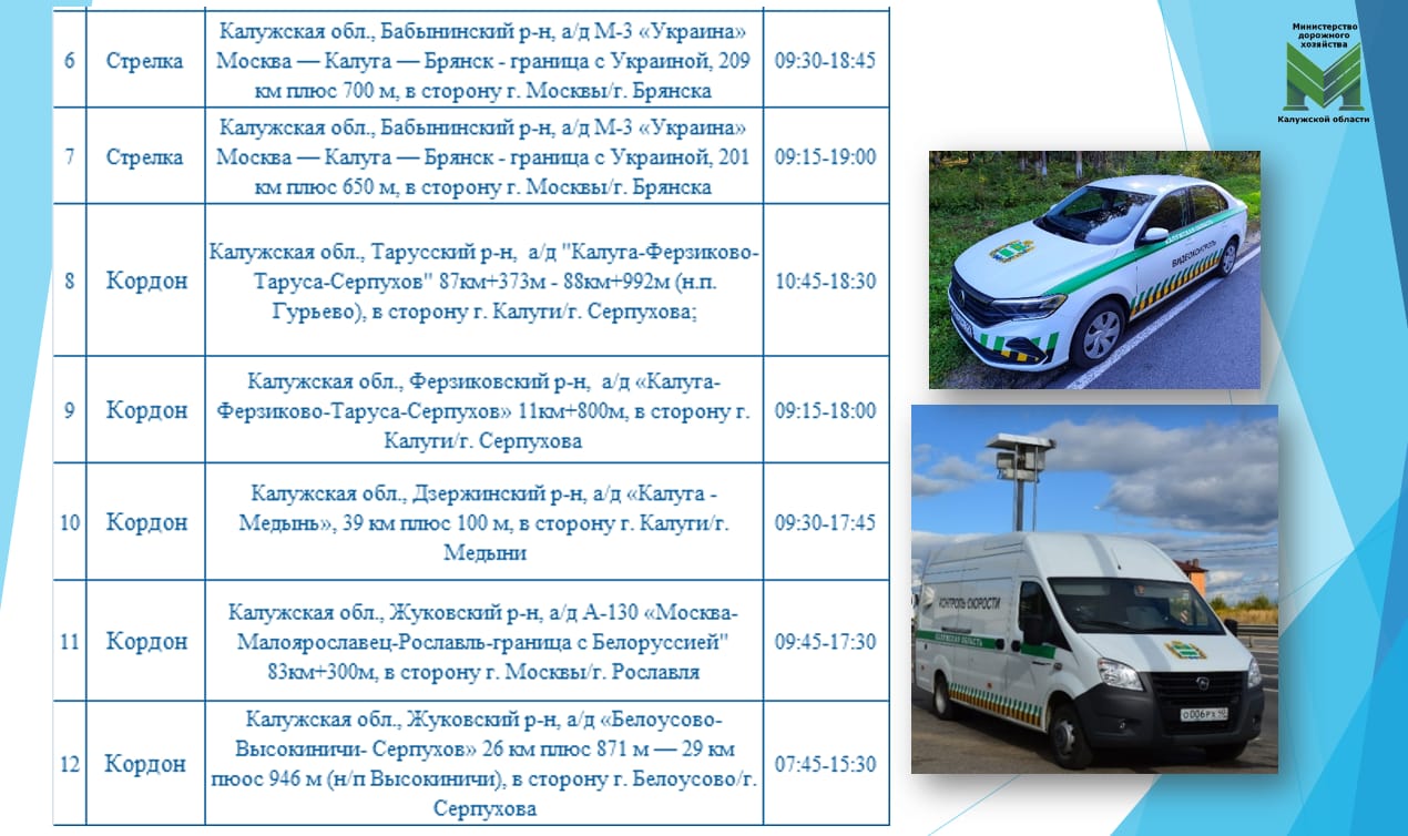 А также на трассе М-3 «Украина» и автодорогах Калуга-Перемышль-Белёв-Орёл-Козельск, Калуга-Медынь, Калуга-Ферзиково-Таруса-Серпухов, Белоусово-Выскиничи-Серпухов, Москва-Малоярославец-Рославль-граница с Беларусью в Жуковском, Тарусском, Ферзиковском, Перемышльском, Мещовском, Бабынинском и Дзержинском районах.