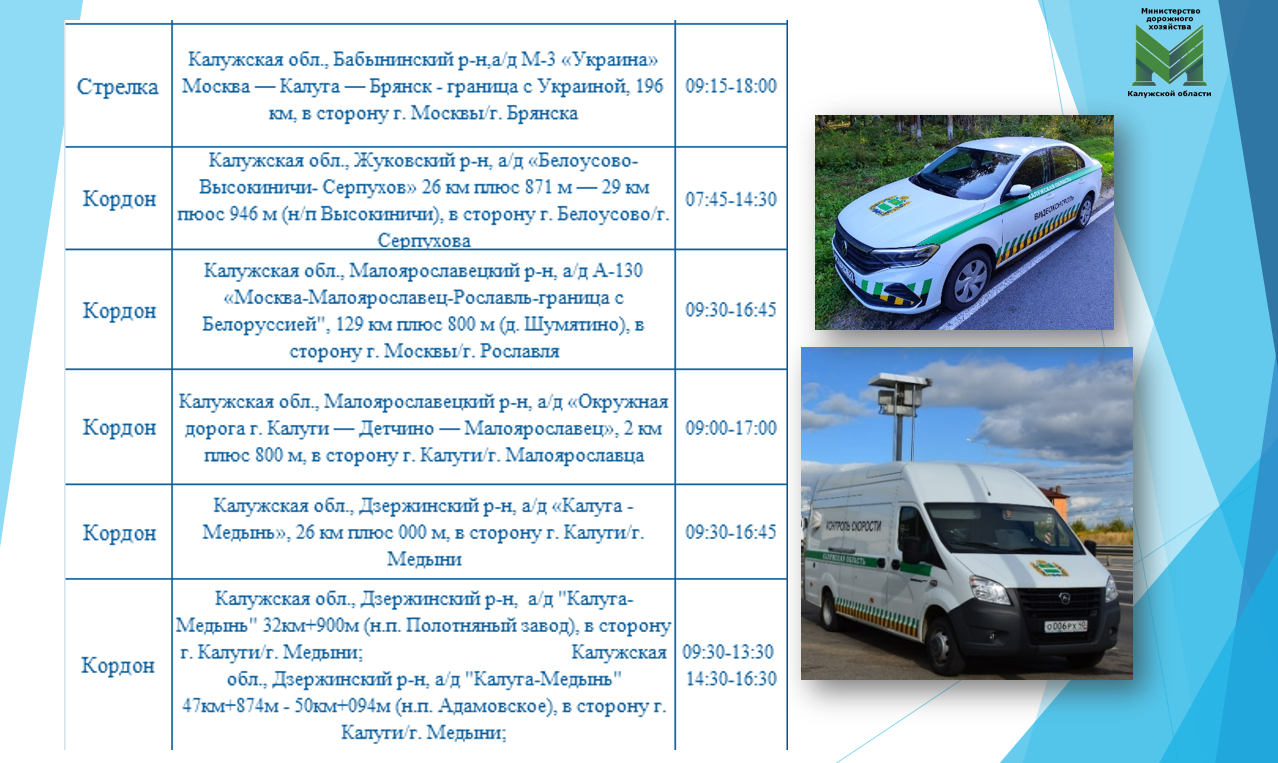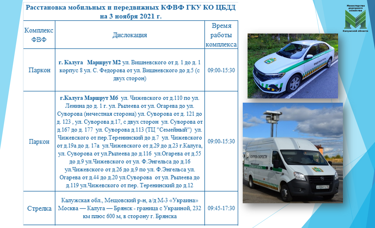 В области видео и фотофиксация проходит на трассах М3 «Украина», А130, дорогах Белоусово – Высокиничи, Калуга – Детчино, Калуга – Медынь.