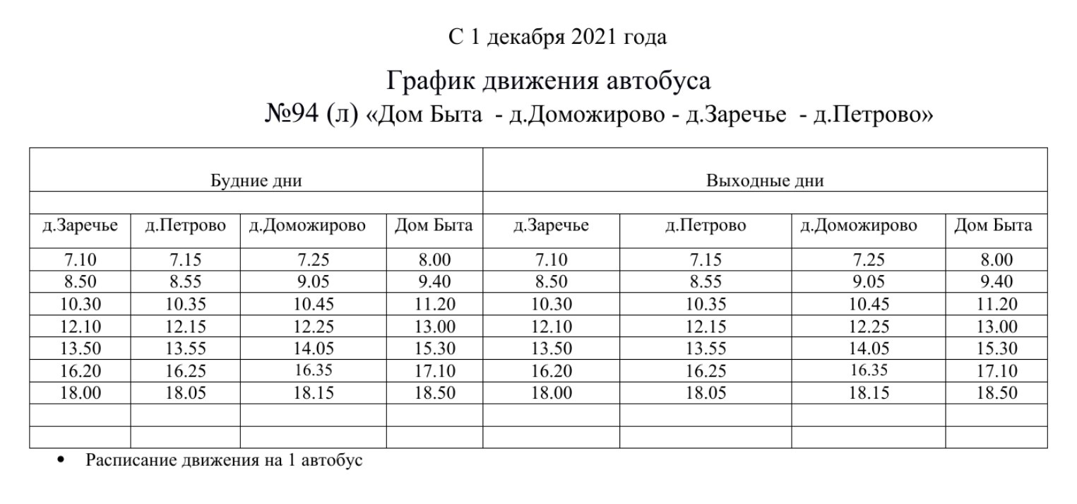 - Деревня Доможирово: 7:25, 9:05, 10:45, 12:25, 14:05, 16:35, 18:15.