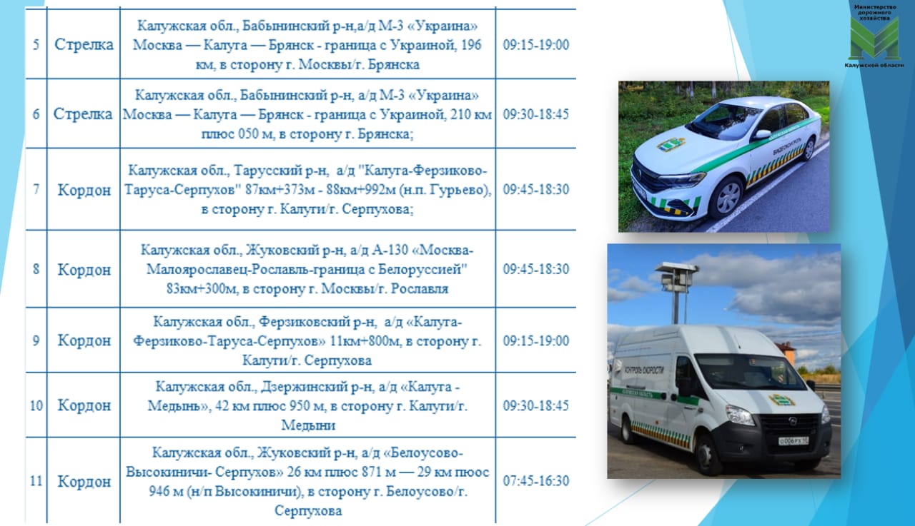 А также на трассе М-3 «Украина» и автодорогах Калуга-Медынь, Калуга-Перемышль-Белёв-Орёл-Козельск, Калуга-Ферзиково-Таруса-Серпухов, Белоусово-Высокиничи-Серпухов, Москва-Малоярославец-Рославль, в Жуковском, Жуковском, Ферзиковском, Бабынинском, Перемышльском, Тарусском и Дзержинском районах.