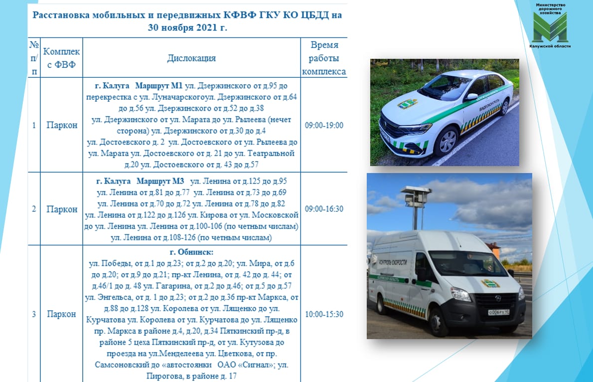 Во вторник, 30 ноября, по данным «Центра безопасности дорожного движения», мобильные и передвижные камеры в Калуге можно будет встретить с 9:00 до 19:00.