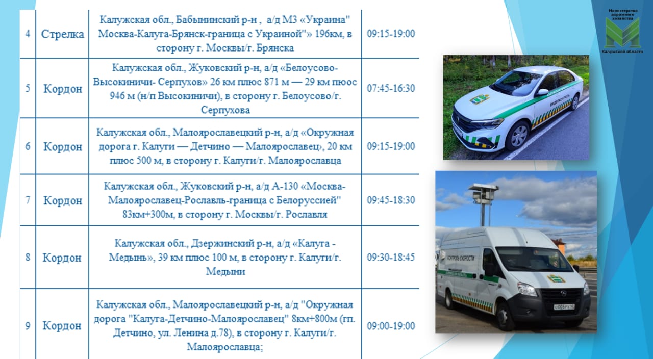 В области видео и фотофиксация проходит на трассе М-3 «Украина» и автодорогах «Окружная дорога города Калуги», Калуга-Медынь, Белоусово-Высокиничи-Серпухов, Москва-Малоярославец-Рославль, в Жуковском, Малоярославецком, Бабынинском и Дзержинском районах.