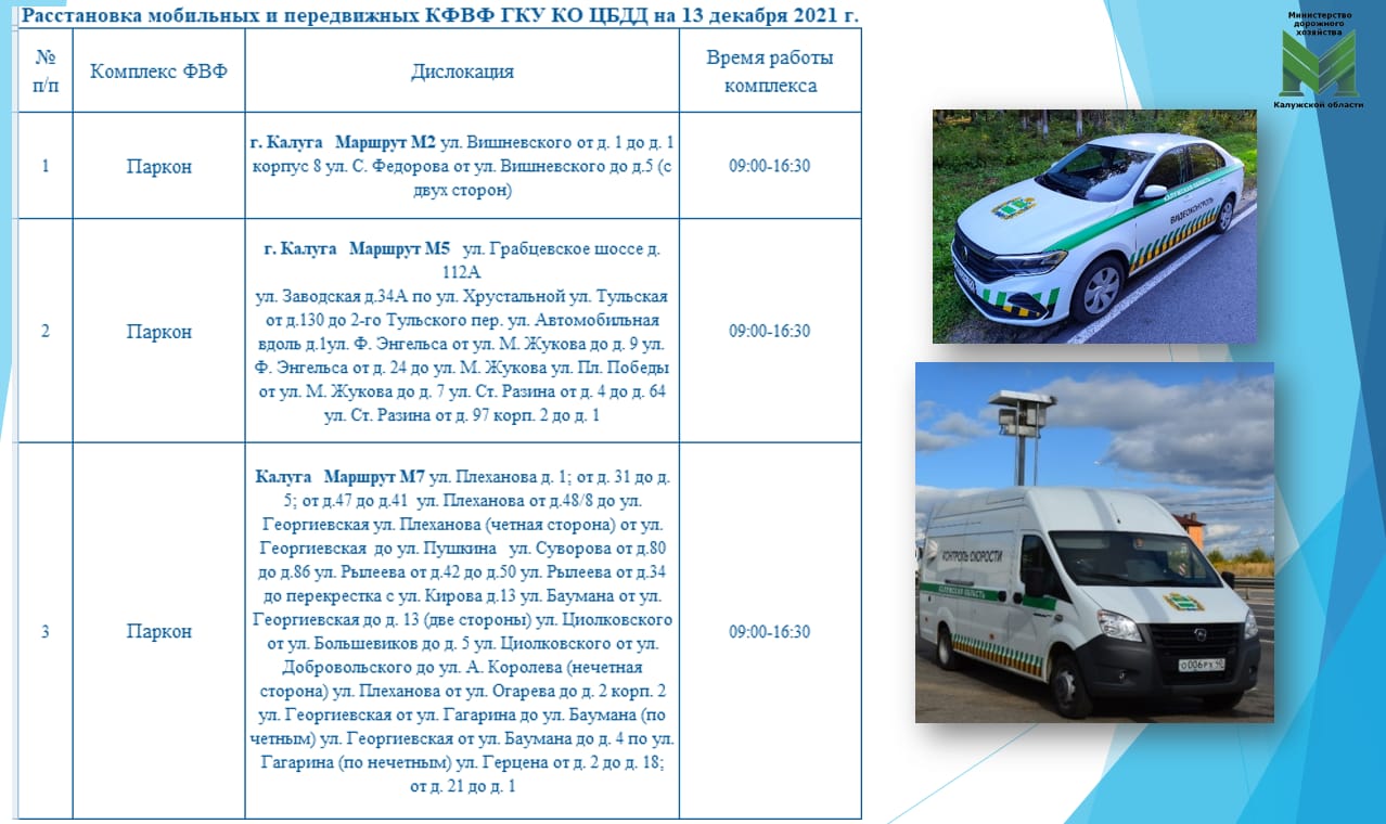 В понедельник, 13 декабря, по данным «Центра безопасности дорожного движения», мобильные и передвижные камеры в Калуге можно будет встретить с 9:00 до 16:30.