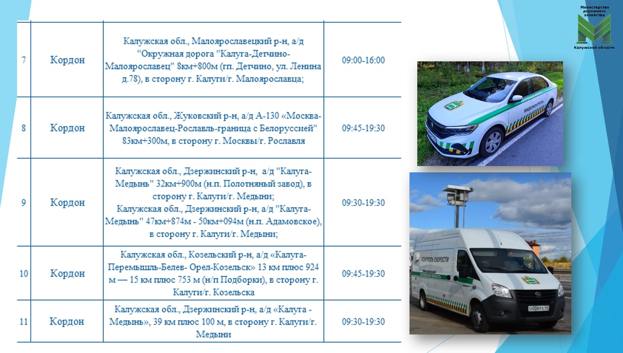В области видео и фотофиксация проходит на трассе М-3 «Украина» и автодорогах «Окружная дорога города Калуги», Калуга-Медынь, Калуга-Перемышль-Белёв-Орёл-Козельск, Москва-Малоярославец-Рославль, в Жуковском, Перемышльского, Боровском, Козельском, Мещовском, Малоярославецком и Дзержинском районах.