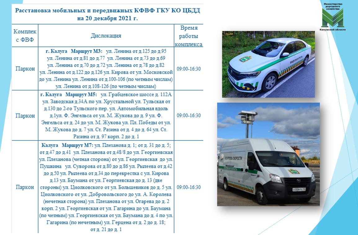 В понедельник, 20 декабря, по данным «Центра безопасности дорожного движения», мобильные и передвижные камеры в Калуге можно будет встретить с 9:00 до 16:30.
