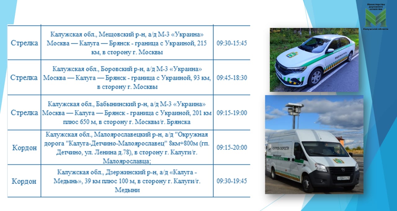 В области видео и фотофиксация проходит на трассе М-3 «Украина» и автодорогах «Окружная дорога города Калуги», Калуга-Медынь в Бабынинском, Боровском, Мещовском, Малоярославецком и Дзержинском районах.