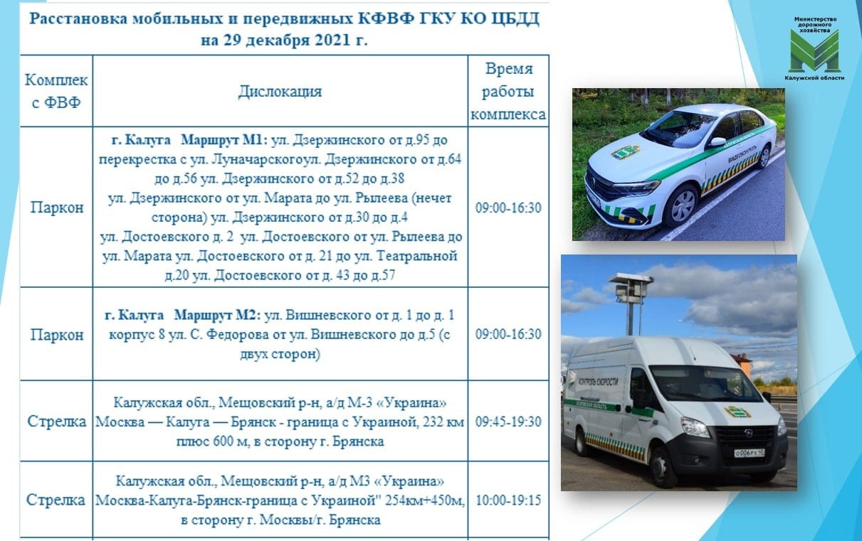 В среду, 29 декабря, по данным «Центра безопасности дорожного движения», мобильные и передвижные камеры в Калуге можно будет встретить с 9:00 до 16:30.