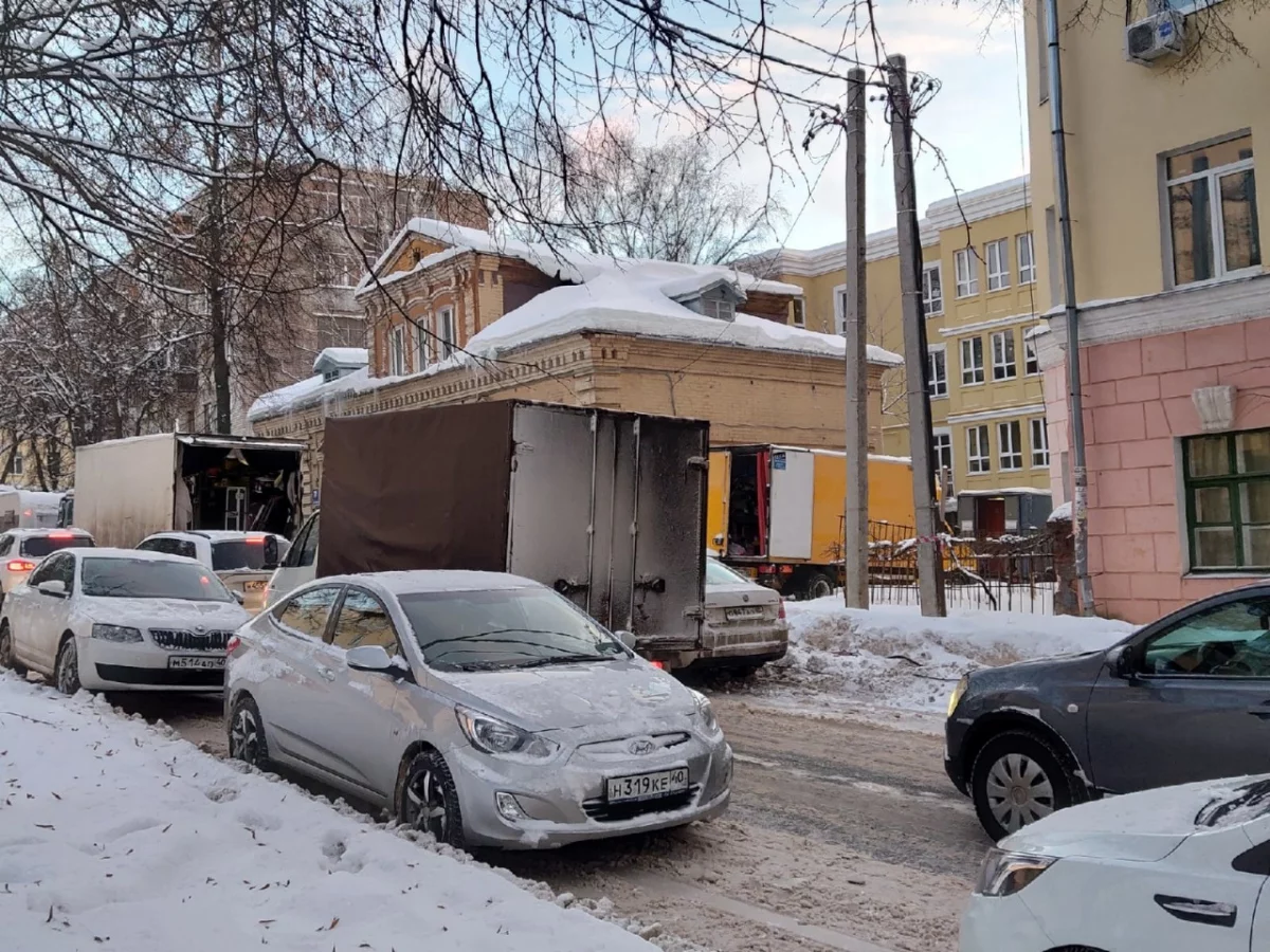 Вдоль улицы с обеих сторон запаркованы автомобили. В основном это техника киношников с московскими номерами, которые снимают фильм.
