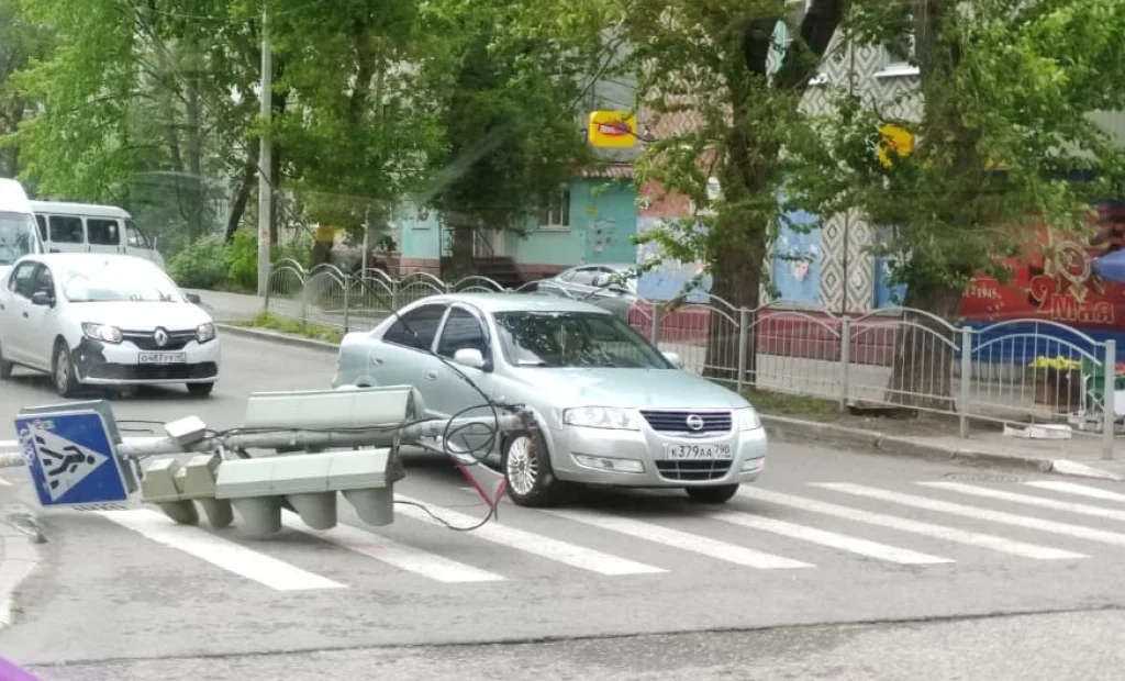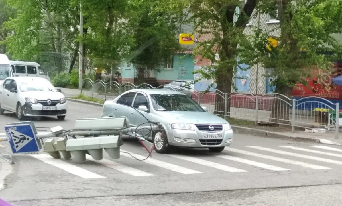 Днем в пятницу, 27 мая, в Калуге столб со светофором упал на перекрестке улиц Энгельса и Жукова. Фото выложили в сообществе «Калуга ДТП».