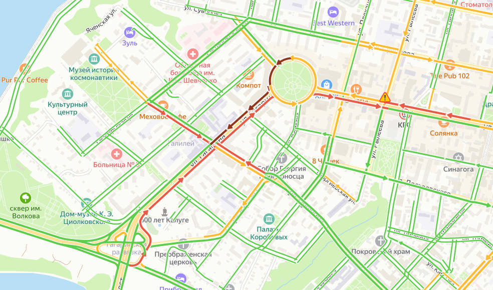 Из-за аварии затруднено движение по улице Гагарина со стороны сквера Мира и по улице Королева со стороны парка Циолковского. Фото пробки на Гагарина опубликовали в сообществе «Калуга ДТП».