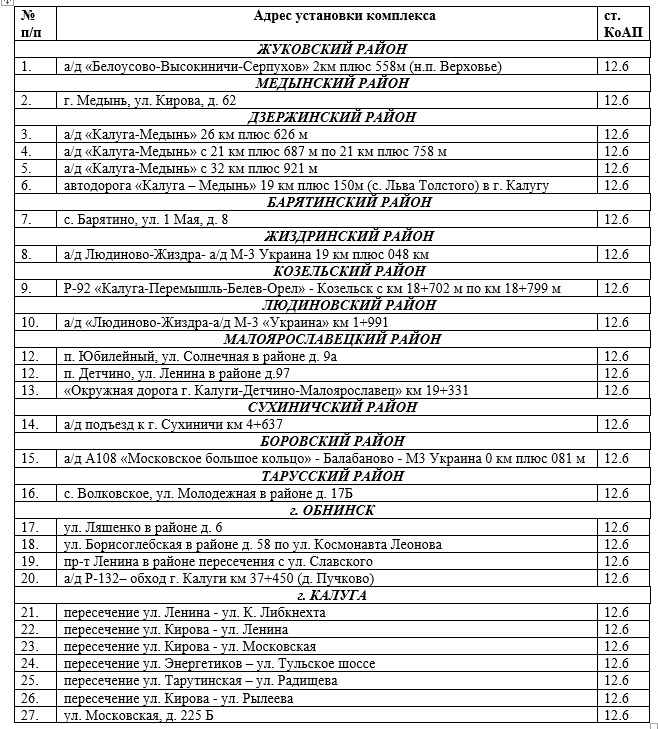 Также такие камеры установлены в Жуковском, Медынском, Дзержинском, Барятинском, Жиздринском, Козельском, Людиновском, Малоярославецком, Сухиничском, Боровском, Тарусском районах и Обнинске.