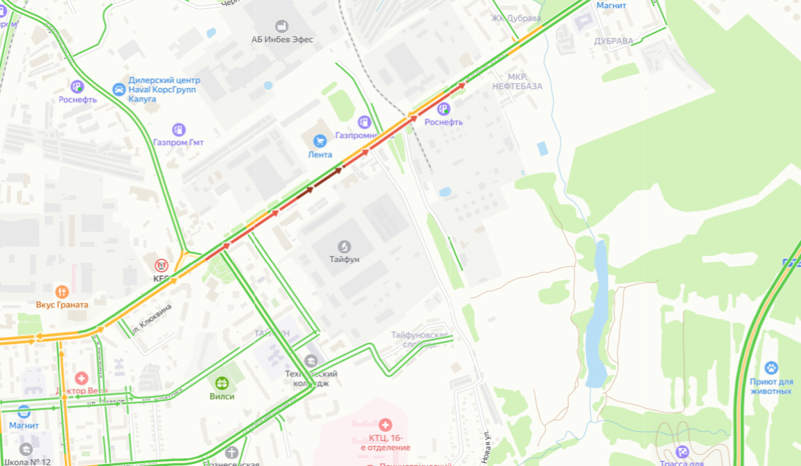 Движение затруднено в районе Нефтебазы из-за ям, которые образовались у железнодорожного переезда. Пробка в сторону Грабцево растянулась на полтора километра.