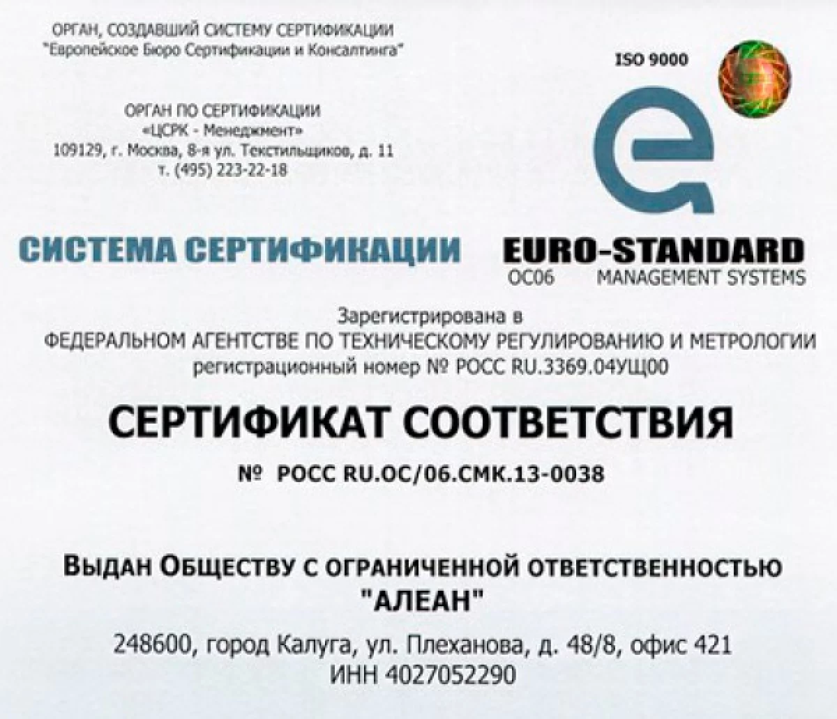 На днях Центр Профессионального Перевода АЛЕАН получил сертификат соответствия, который удостоверяет, что система менеджмента качества услуг, оказываемых центром, соответствует требованиям ISO (International Organization for Standardization - Международной организации по стандартизации). Наличие подобного сертификата говорит о европейском уровне компании.