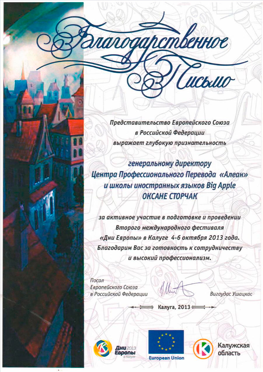 Центр Профессионального Перевода «АЛЕАН» получил благодарственное письмо от посла Европейского Союза в РФ Вигаудаса Ушацкаса за активное участие в подготовке и проведении международного фестиваля «Дни Европы» в Калуге, который прошел 4-6 октября. Он также подчеркнул готовность к сотрудничеству и высокий профессионализм сотрудников компании «АЛЕАН».