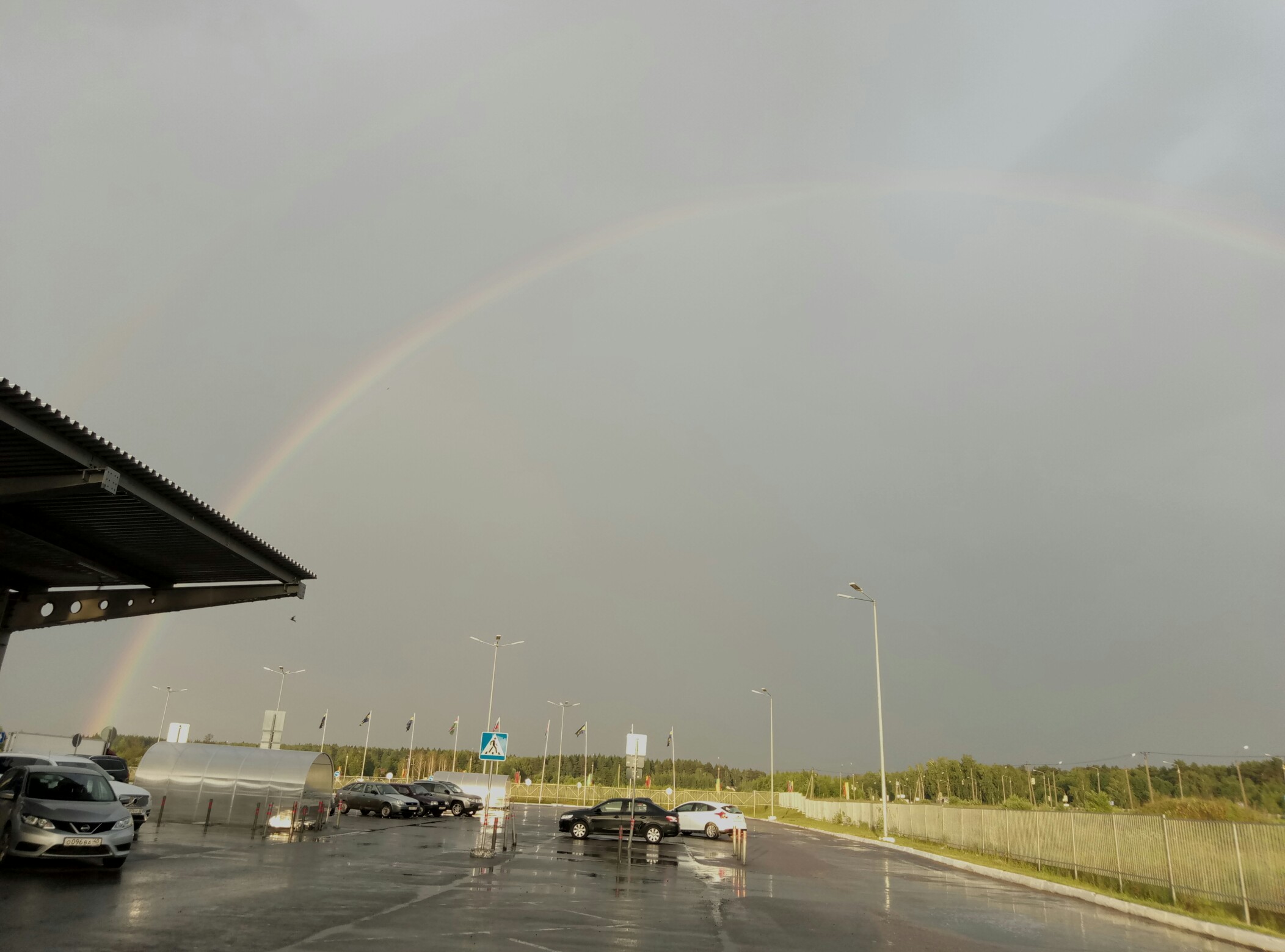 Калуга встретила команду дождливой погодой. А спустя час после прилета город и вовсе накрыла гроза, после которой небо украсилось радугой.