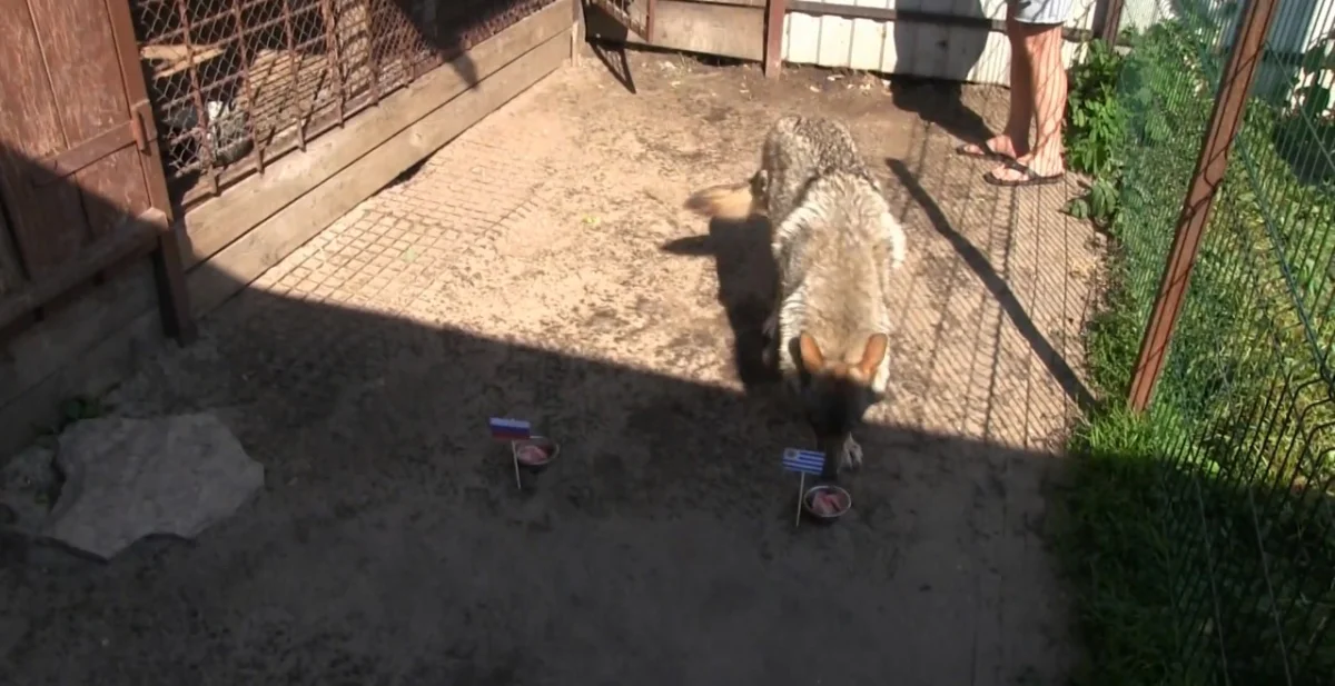 Однако сегодняшний матч заявлен как Уругвай – Россия, потому и флажки были переставлены соответствующим образом. И Шива посрамила своих критиков показав им, что не в мисках дело. Волчица, выйдя из вольера, направилась прямиком к сборной Уругвая. Заглотив содержимое уругвайской кормушки, Шива ткнулась было в российскую, но передумала и убежала в вольер, тем самым однозначно дав понять, что соперник россиян окажется слабее и победа будет наша!