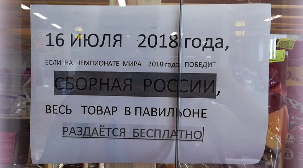 Один из калужских предпринимателей разметил в своём магазине объявление: «16 июля, если на чемпионате мира 2018 года победит сборная России, весь товар в павильоне раздаётся бесплатно!».