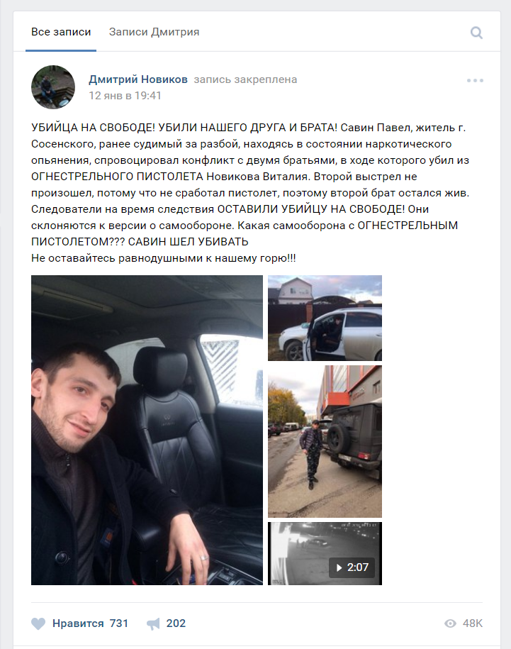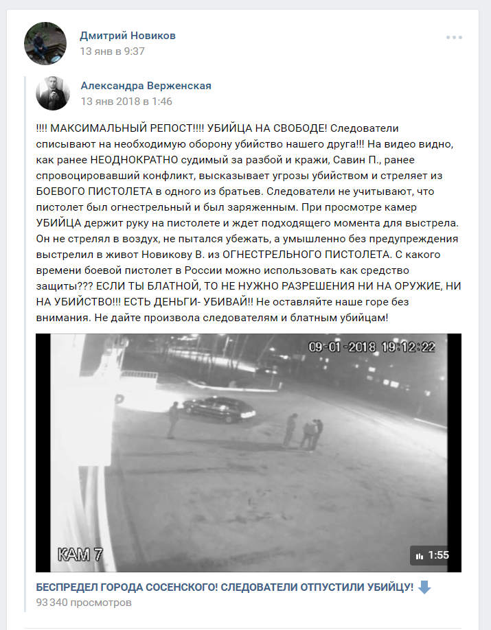 Разборки у автомойки в городе Сосенском, в результате которых погиб местный житель Виталий Новиков, попали в новостные ленты не только региональных, но и федеральных СМИ. В основном, благодаря стараниям родных погибшего, которые развернули в соцсетях и в городе настоящую кампанию против Павла Савина, застрелившего Виталия. Вот только некоторые тезисы, которые активно тиражируются в соцсети «Вконтакте» близкими покойного: «Следователи оставили убийцу на свободе!», «Следователи списывают на необходимую оборону убийство нашего друга», «Неоднократно судимый за разбой и кражи, Савин П., ранее спровоцировавший конфликт, высказывает угрозы убийством и стреляет из боевого пистолета в одного из братьев».