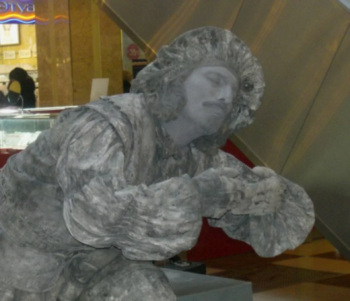 На днях в одном из крупных торговых центров Калуги появилась необычная скульптура. На первый взгляд это каменное изваяние, напоминающее известного живописца Рембрандта. Но стоит присмотреться, и вы заметите, как скульптура медленно под музыку меняет позы.