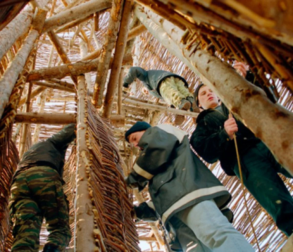 От волонтеров требуется - собирать материал в лесу (березовую лозу) и оплетать им скульптуру. За это им гарантируют проживание в палатке, трехразовое питание, указание их как соавторов произведения в материалах.