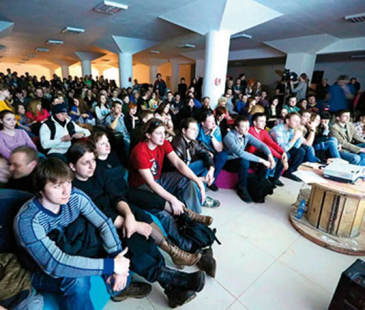 Киногостиная на АРТзаводе представляет собой мягкие диваны и подушки, расположенные перед большим экраном.
