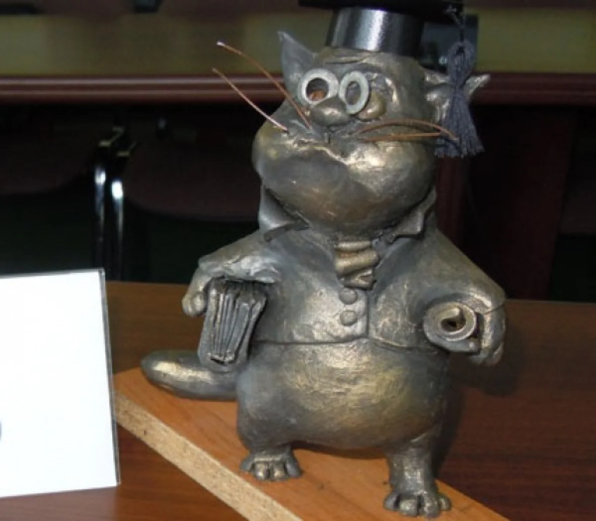 - Он представляет собой скульптурную фигуру волевого и целеустремленного «ученого кота», сосредоточенного на достижении научных целей и задач современной науки, - так описали скульптуру авторы. -  В своих лапах он крепко держит атрибуты научной деятельности.