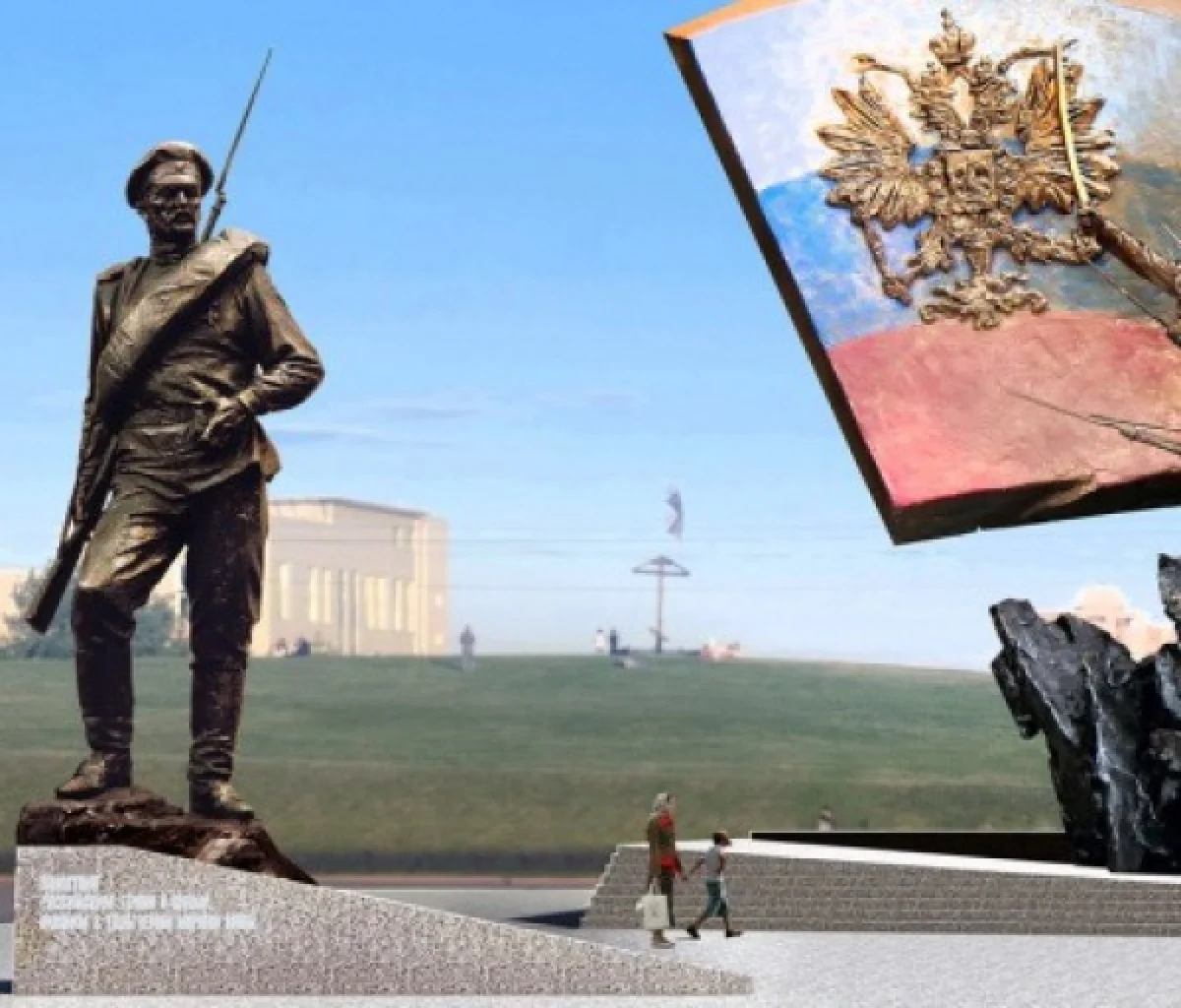 Монумент будет состоять из двух частей. Одна из них - почти 10-метровая фигура солдата с винтовкой-трехлинейкой через плечо и Георгиевским крестом на груди. Вторая часть - развивающийся российский флаг.