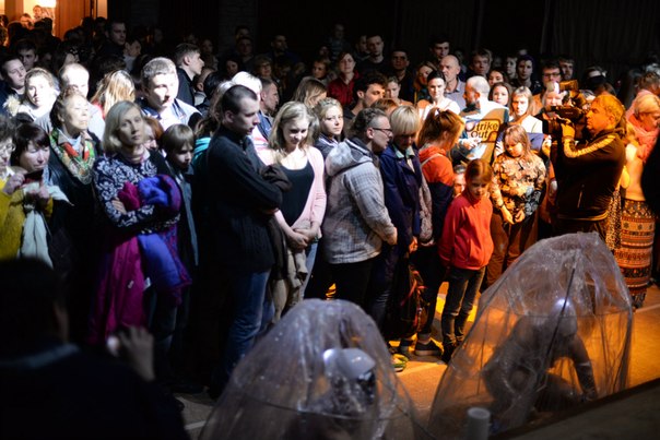 В это время в зале шла подготовка к следующему танцевальному перформансу – от калужской лаборатории «ТЕКТ». Несколько человек приклеивали к полу громадное полиэтиленовое полотно. Когда спустя какое-то время я снова оказалась в зале, ещё один мой коллега честно предупредил: «Имей в виду, здесь обсыпают мукой».