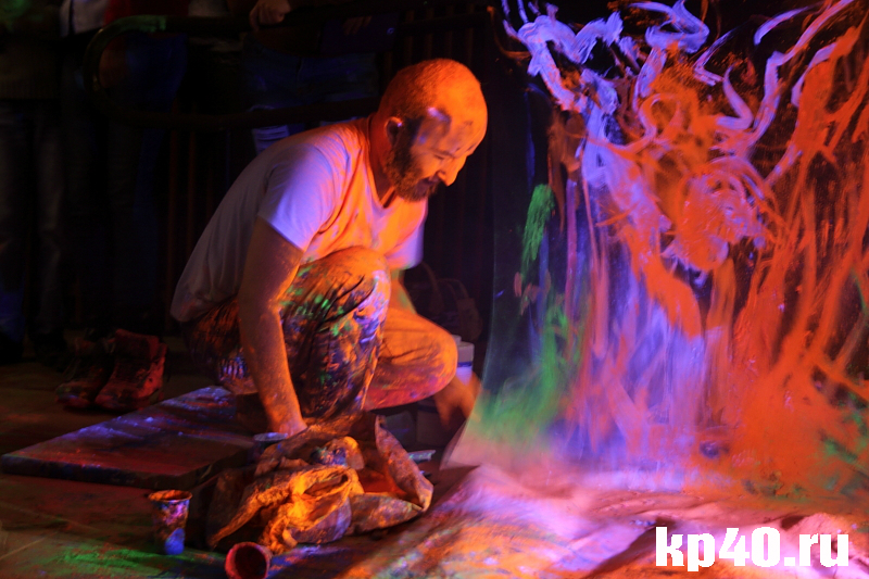 В фойе тем временем готовился к перформансу художник Борис Пономарёв. Он расстелил длинное чёрное полотно, разложил рядом кисти и краски. Краски были не обычные – флуоресцентные. Шоу обещали в формате 3D, поэтому желающие могли воспользоваться специальными очками для более полного восприятия действа. На всех жаждущих спецочков не хватило, поэтому тем, кому они не достались, пришлось воспринимать происходящее таким, какое оно есть.