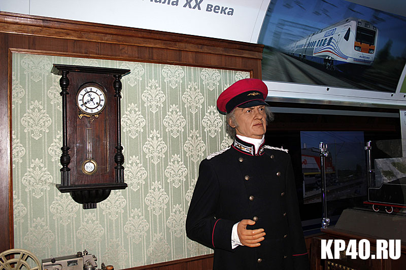 Экспонаты следующего вагона, в который мы направляемся, рассказывает об истории и развитии российской железной дороги. Нас встречает «начальник» станции конца XIX – начала XX веков.