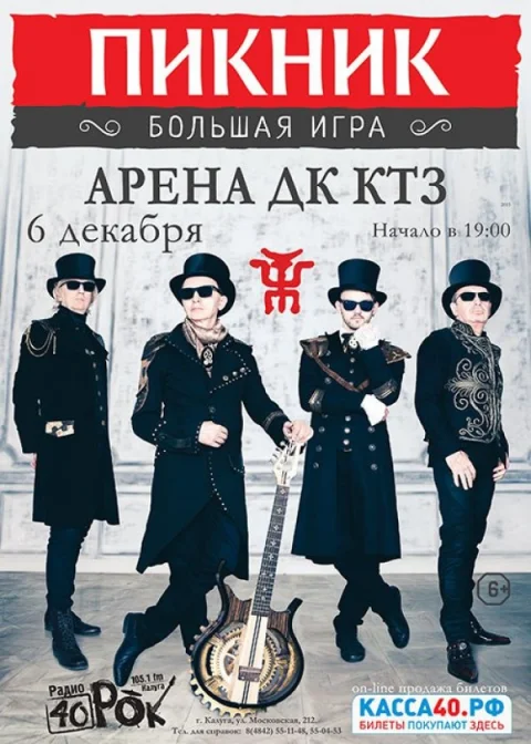 Продолжаем розыгрыш билетов на концерты. В ближайшее воскресенье, 6 декабря, на сцене ДК «Арена КТЗ» выступит легендарная рок-группа «Пикник». Музыканты представят в Калуге свою новую программу «Большая игра».