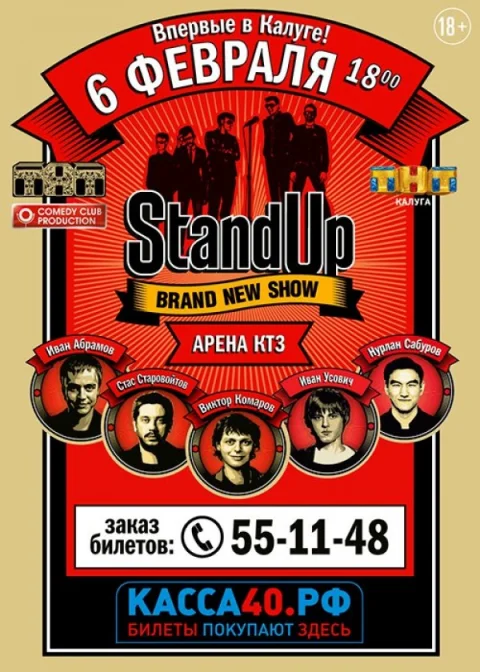 В субботу, 6 февраля, в Калуге состоится выступление звёзд шоу StandUp, выходящего на телеканале ТНТ. К нам приедут Виктор Комаров, Иван Абрамов, Стас Старовойтов, Иван Усович и Нурлан Сабуров.