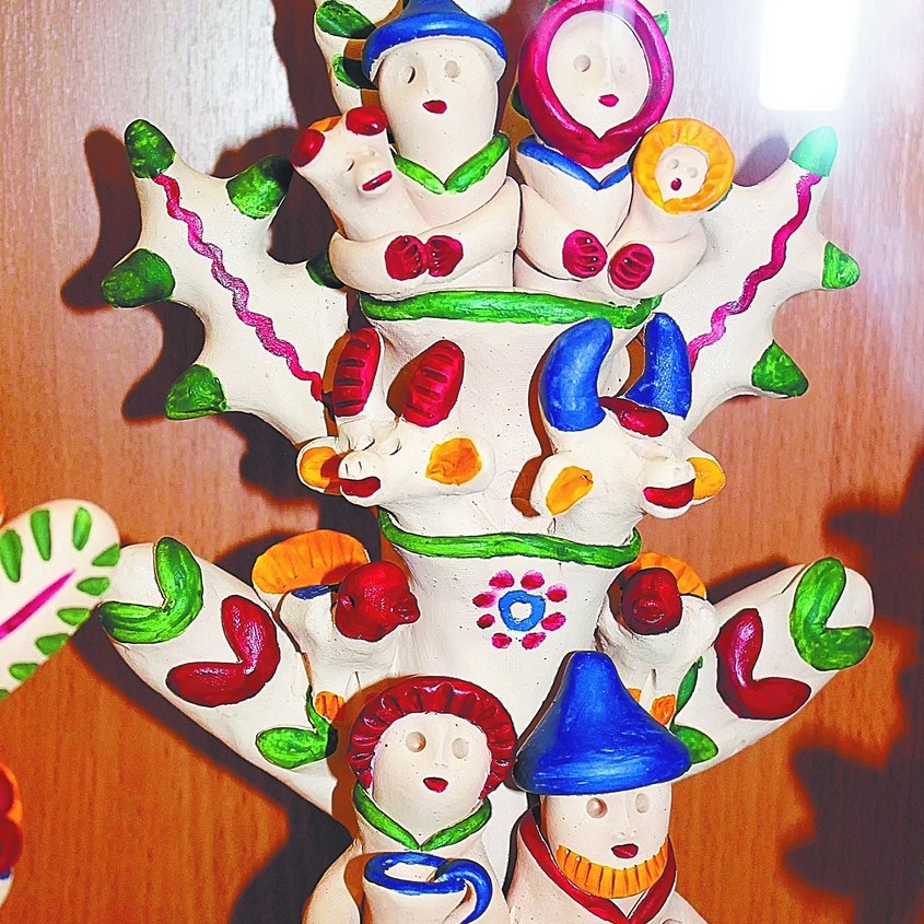 — Я, когда леплю, представляю, какую хочу семью: чтобы двое-трое детей, чтобы цветы были, собачка, кошка, — объясняет мастерица. — И всё это воплощаю в глине. Или вспоминаю свою подругу, её семью. И обязательно думаешь о том, что семья счастливая. Сюжетов много. Хлудневские игрушки многофигурные. Например, древо жизни объединяет людей и жителей леса — птиц, зверей. Это взаимодействие человека с природой. Вот наверху дерева сидит дед, держит медвежонка, а внизу — медведь с чашками, помогает деду их нести. Все вместе, все дружат. Сначала отдельно лепятся фигурки, потом собираются в одну композицию. Есть ярмарочная тема — дед едет на лошади на базар продавать свинью и утёнка или дед-лотошник свистульки продаёт, рядом — барыня с кувшином его встречает. Точечки на игрушке — это зёрнышки, солнышко — чтобы зёрнышки росли. Каждый символ что-то обозначает.