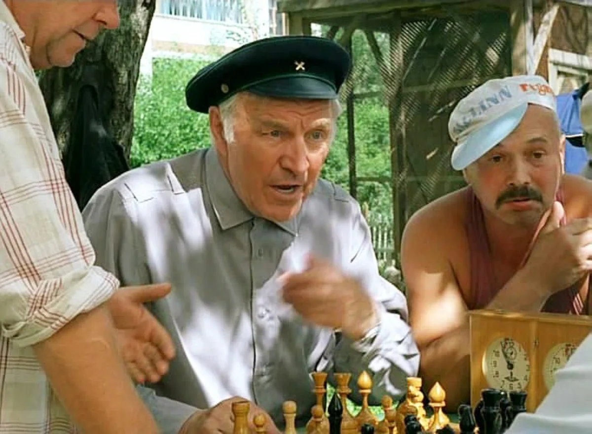 Здорово сыграли все наши актёры-мужчины. Конечно, Скарлатина в исполнении Славы Голоднова получился незабываемым. Но и все остальные, игравшие соседей за шахматным столом, были хороши и создавали нужную атмосферу.
