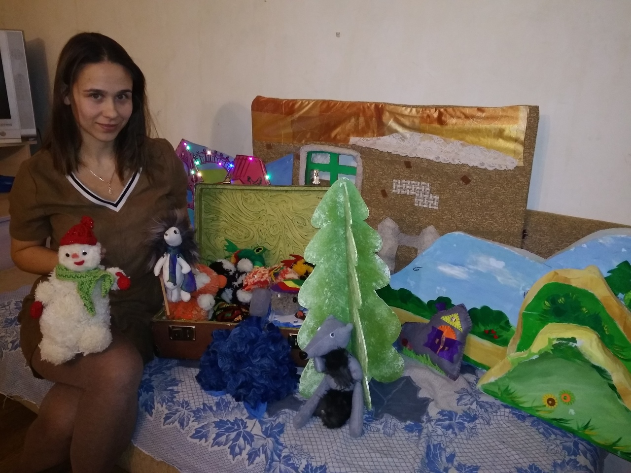 — Идея с чемоданом возникла не сразу, — говорит Людмила. — Сначала мы рисовали ширмы, думали, каких они должны быть размеров, как будем их перевозить, устанавливать. А ведь мы девчонки, не станем же каждый раз кого-то просить помочь. И тут я говорю: «Нам бы чемодан! Туда просто можно весь реквизит сложить!» Но оказалось, что ни у кого нет чемодана. Призвали друзей — они и помогли. Мы даже на улице потом чемоданы находили. В итоге набралось несколько. Для реквизита используем большой чемодан, а сказочница к детям выходит с маленьким.