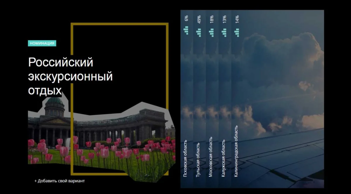 В этом году наш регион заявлен в номинации «Российский экскурсионный отдых». На момент опубликования этой статьи за Калугу было отдано 13% голосов, а в лидерах Тула с 49-ю процентами.