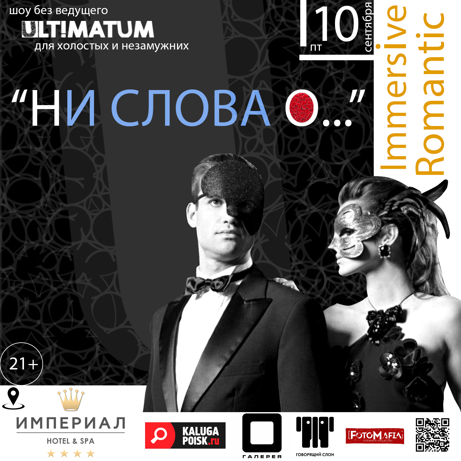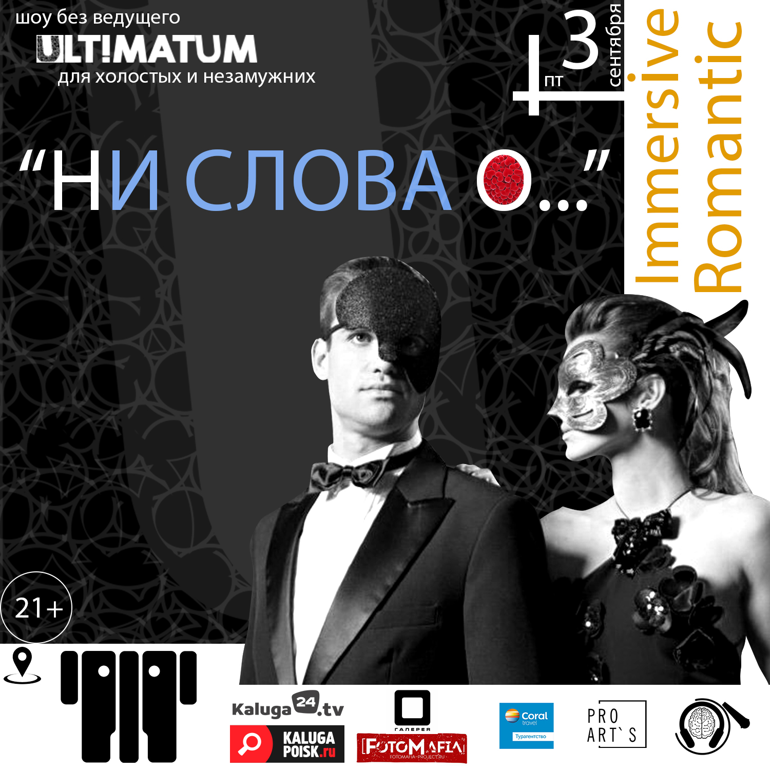 «Ни слова о…» - это спектакль с элементами импровизации, шоу от профессиональных актёров и танцоров, фуршет, игры и, конечно, то, ради чего всё это делается, – шанс познакомиться с интересными людьми и даже обрести свою любовь.