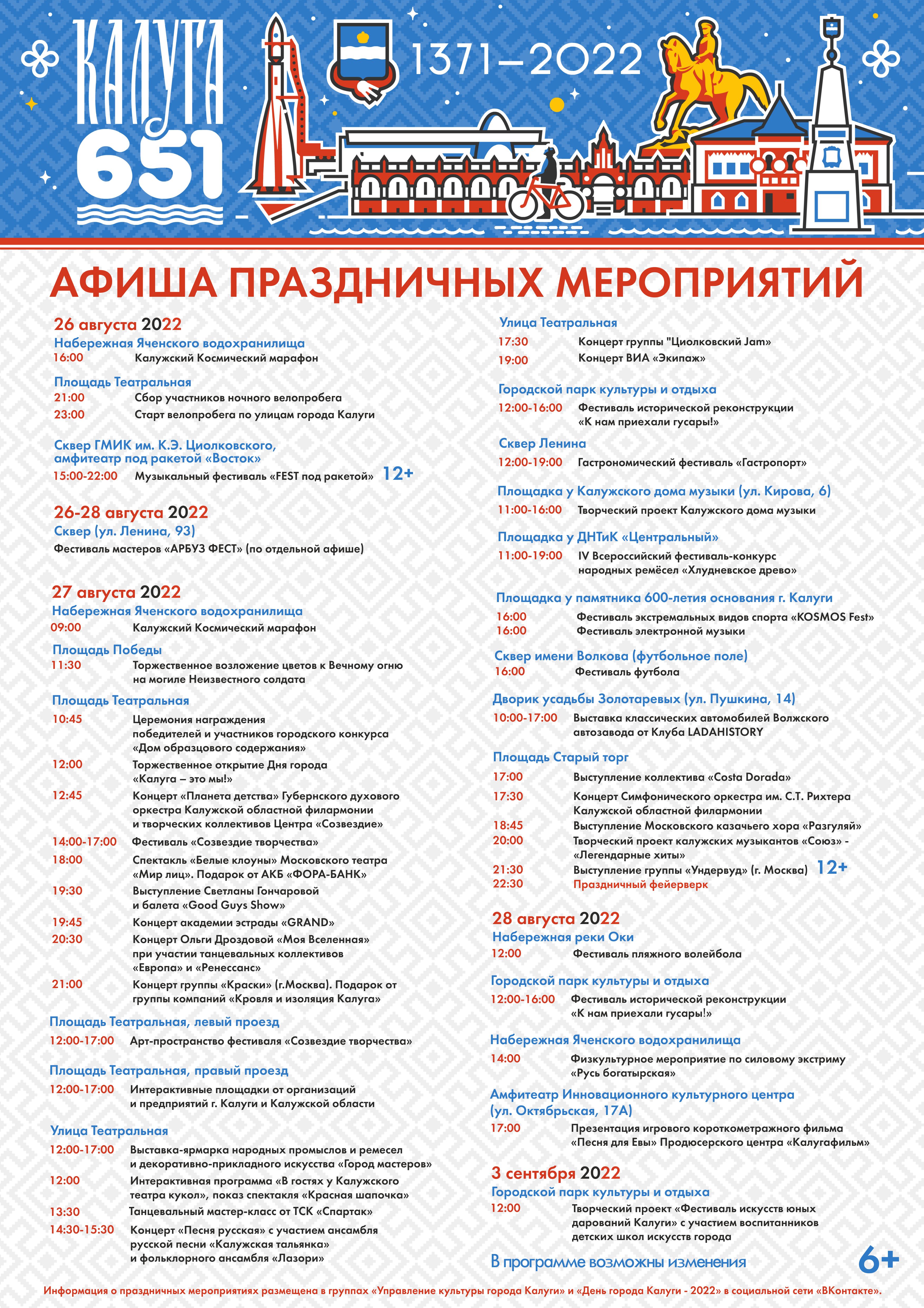 В конце августа Калуга отметит свое 651-летие. В понедельник городская управа опубликовала полную афишу Дня города.