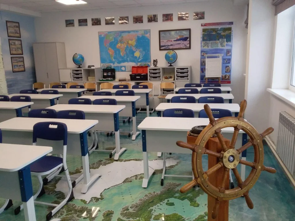 Оборудование кабинета, оформленного в морском стиле (включая штурвал и интерактивную доску), предоставлено Федеральным агентством по недропользованию. Уникальным элементом дизайна является пол, стилизованный под стеклянную карту мира.