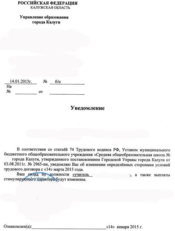 В документе, в частности, приводится следующая формулировка: «В соответствии со статьёй 74 Трудового Кодекса РФ, Уставом муниципального бюджетного общеобразовательного учреждения уведомляю Вас об изменении определённых сторонами условий договора с 14 марта 2015 года. Ваш оклад, а также выплаты стимулирующего характера будут изменены».