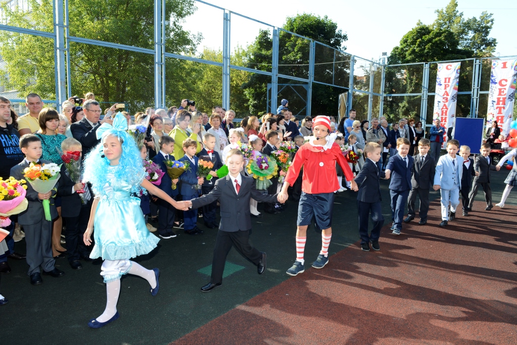 На спортивной площадке, где проходили торжества, ребят веселили сказочные герои Буратино и Мальвина, был исполнен гимн школы.