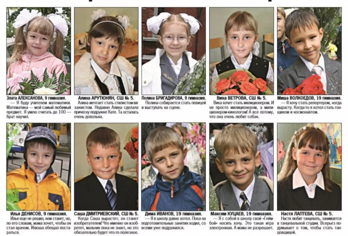 Нам удалось разыскать некоторых из них. Из смешных первоклашек они превратились в красивых девушек и юношей. Кстати, оказалось, что родители многих из них до сих пор хранят в своих семейных альбомах тот номер «Калужского перекрёстка» за 1 сентября 2008 года.