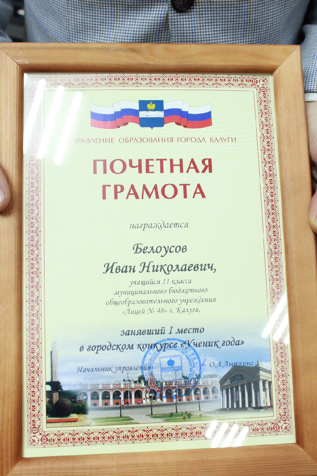 Победителем конкурса в нынешнем году стал учащийся 11 класса МБОУ «Лицей №48» Калуги Иван БЕЛОУСОВ (на фото).
